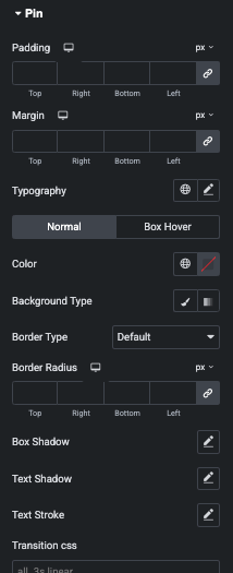 Also, You can manage Color, Background, Border, Shadow, Transition and Transform CSS Effect for Normal and Hover State of Pin.